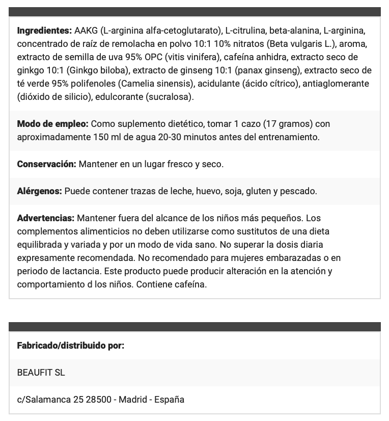 El campo de batalla no es solo físico, sino mental. Por eso combina estimulantes y nootrópicos para mantenerte en estado de alerta. La cafeína te carga de energía, mientras que el Ginkgo Biloba y el Panax Ginseng aumentan tu claridad mental. La Camelia Sinsensis con su riqueza en polifenoles, mantiene tu foco láser en cada repetición.